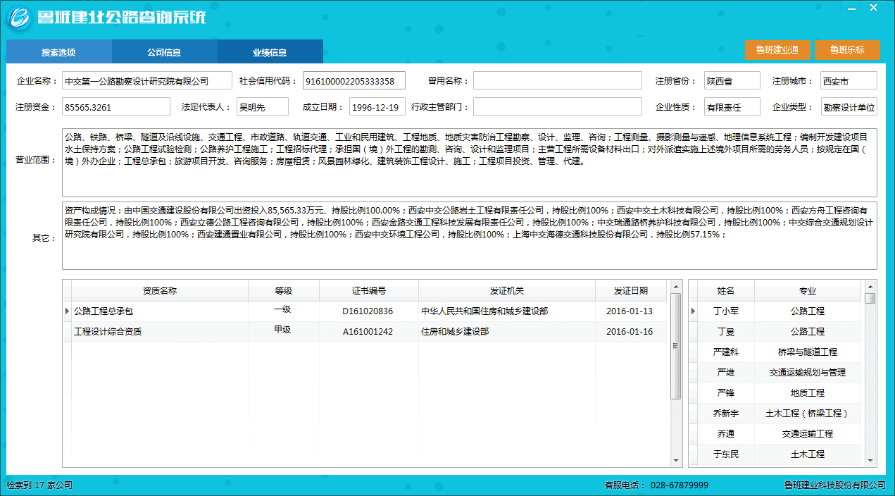 公路查询系统在筛选业绩时,可指定企业名称,指定企业性质(如国有、外资、有限责任、民营等),指定企业注册资金,营业范围和其他。